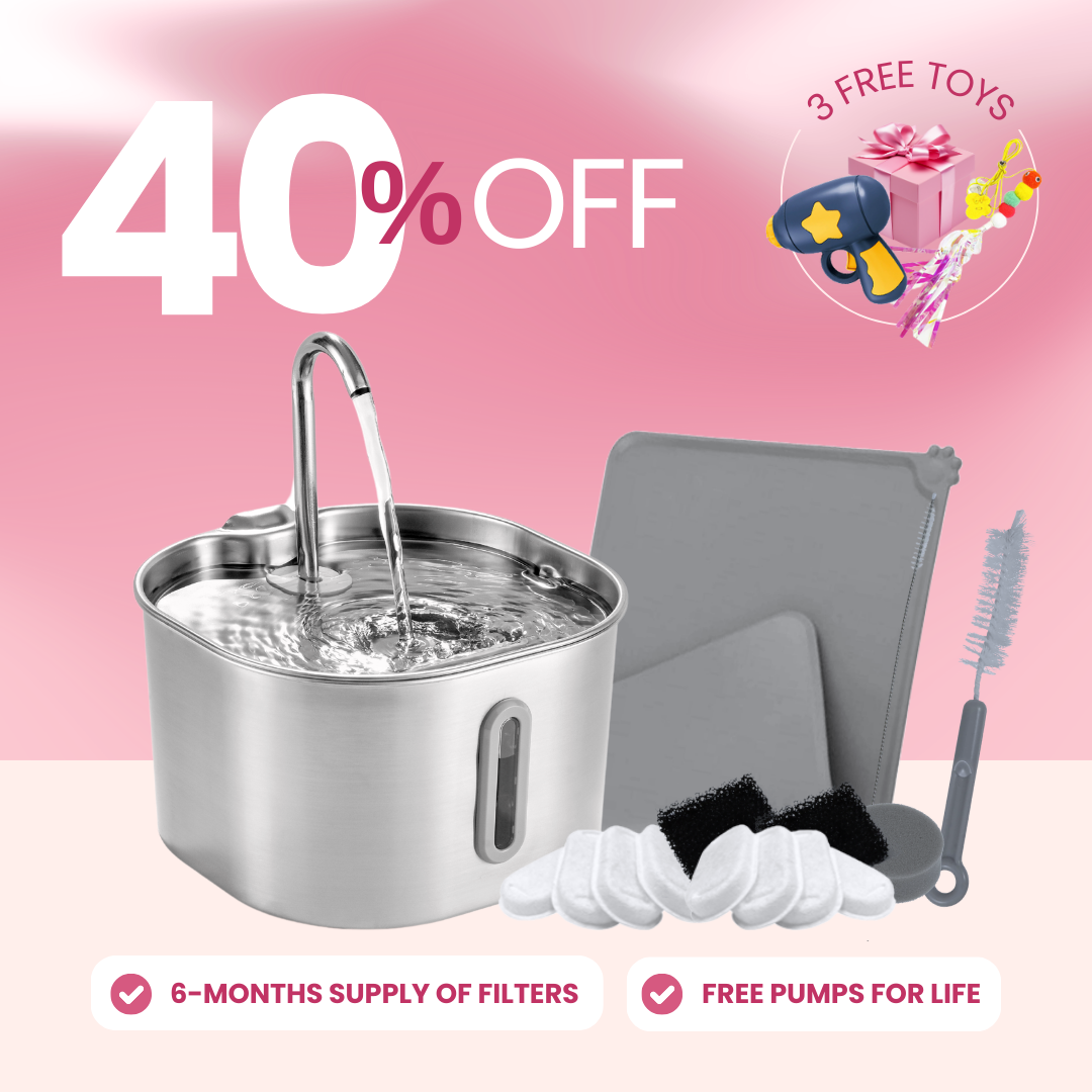 Elevate your cat's hydration and playtime. Enjoy a 6 months worth of filters, no water messes, and a lifelong peace of mind with water pump replacements.