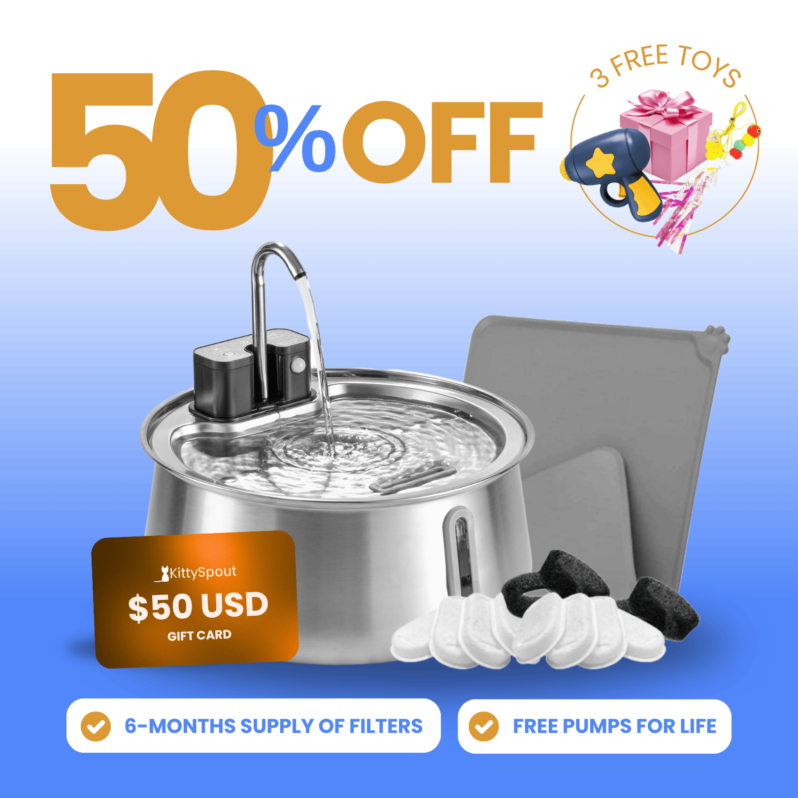 Elevate your cat's hydration and playtime. Enjoy a 4 months worth of filters, no water messes, and a lifelong peace of mind with water pump replacements.