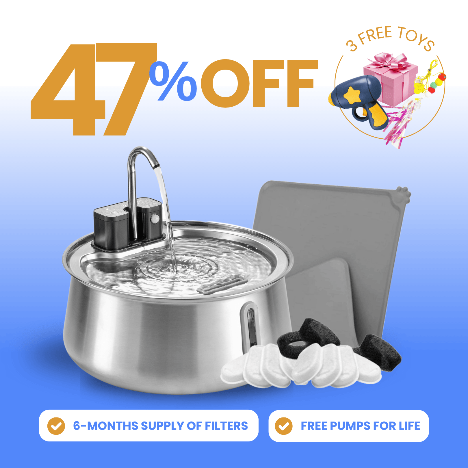 Elevate your cat's hydration and playtime. Enjoy 6 months worth of filters, no water messes, and a lifelong peace of mind with water pump replacements.